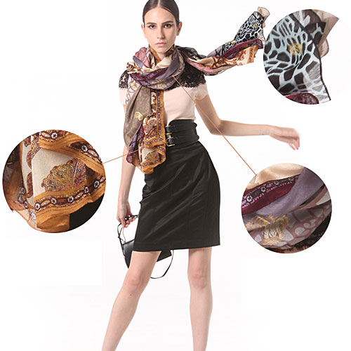 Fashion European Office Lady Mulberry Silk Scarf Pashmina Shawls Wrap Wholesale1. Feature:Wholesaler 2012 new arrival autumn and winter European Office Lady style pashmina scarves at competitive price, designed for those fashionable trendy women, Made of 100% mulberry silk, very soft and comfortable feeling, ultra light texture like the elegant dancing butterfly, the fashion retro stone and branch grain will be the eye-catching element for you at street or party. showing graceful as the scarf, and charming as the pashmina shawl wrap stole, both fashion and warm, and of course, you can aslo have multi different colors wind together to have the special visual impact.(Tips:In order to maintain the adventage of cashmere shawl scarves ,please using warm water and mild scour to knead when washing.Never insulate under the sun or hightemperature,and iron when dried.)