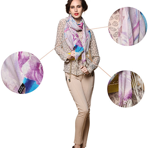 Urban Retro Textile Printing Wool Scarf Infinity Tassel Pashmina Shawl Scarves Wholesale1. Feature:This emerging retro style fashion printed scarf passel pashmina shawl scarves are made of 100% pure wool, environmental materials, very soft and comfortable feeling. the elegant and noble peony pattern with the magic color gradiant are the feature of it. and of course, you can aslo wear multi different colors of silk scarf wind together to have the special visual impact. (Tips:In order to maintain the adventage of shawl scarves ,please using warm water and mild scour to knead when washing.Never insulate under the sun or hightemperature,and iron when dried.)