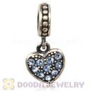 Sterling Silver European Light Sapphire Pave Heart Dangle With Light Sapphire Austrian Crystal