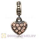 Sterling Silver European Light Peach Pave Heart Dangle With Light Peach Austrian Crystal